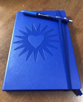 Beautiful Cobalt Blue Journal with the Adironnda Radiant Heart embossed on cover. Journal is hard leatherett cover with lines on 120 pages. Pen is Gel InkJoy Papermate